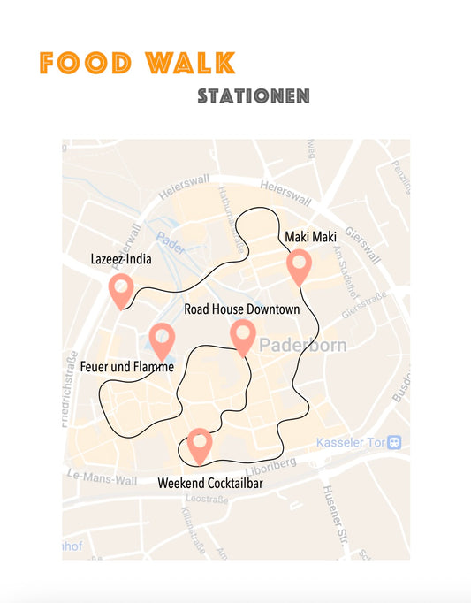 🗺️ Auf euch warten 5 Stationen 📍 voller Köstlichkeiten (4 x Bites + 1 Drink) 🌮🍝🥗🍸 Entdecke die besten Café & Restaurants und verbringe eine tolle Zeit mit gutem Essen und reichlich Bewegung 👯♂️